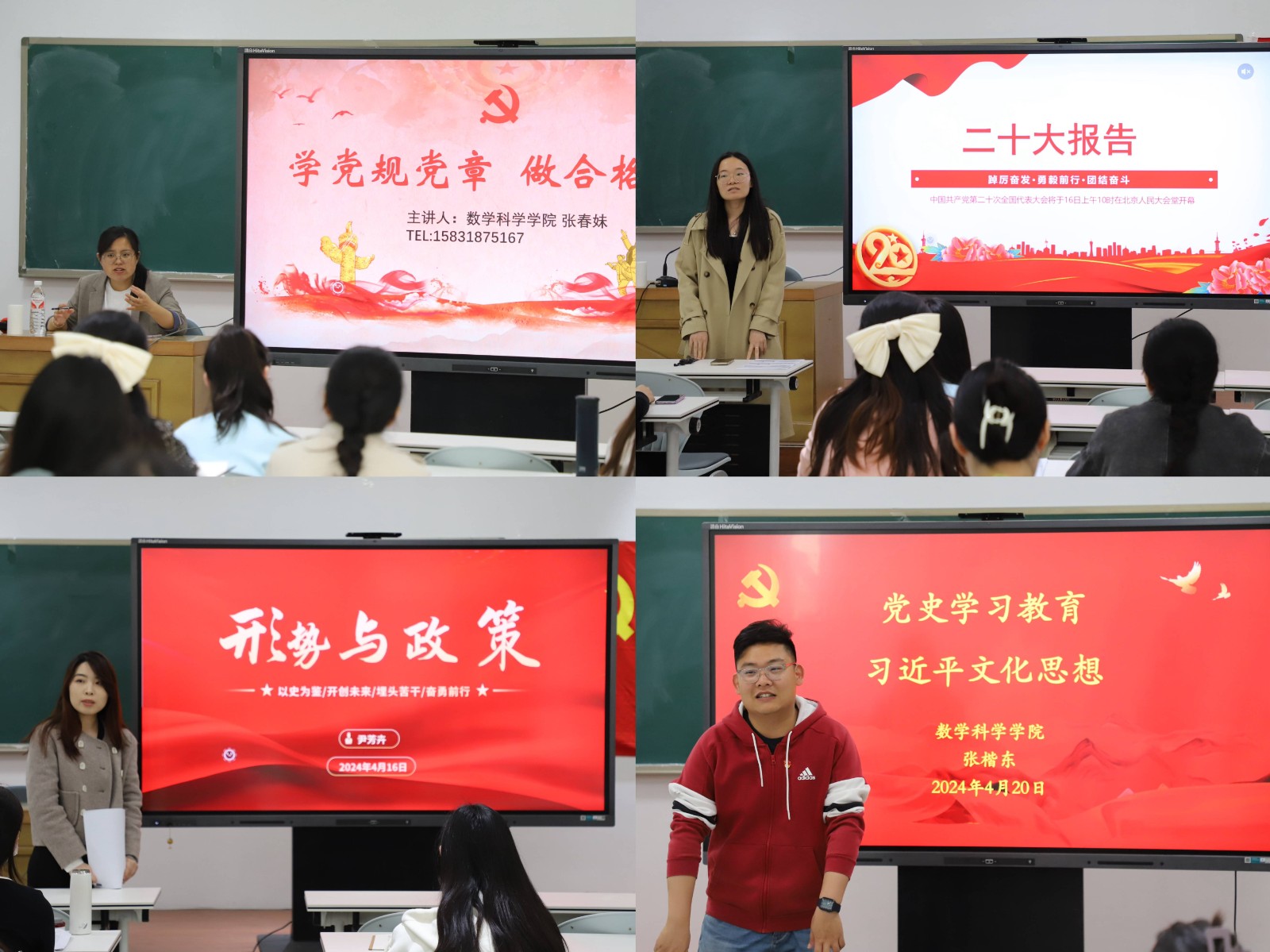各学生党支部书记分别以《中国共产党章程》、《中国共产党发展党员工作细则》、《学习解读党的二十大精神》、《形势与政策》、《党史学习教育,习近平文化思想》为题,带领同学们深入了解党的宗旨和指导思想,增强党性修养,引导同学们坚定不移听党话、跟党走,肩负民族复兴重任,未来让青春之花绽放在祖国最需要的地方。