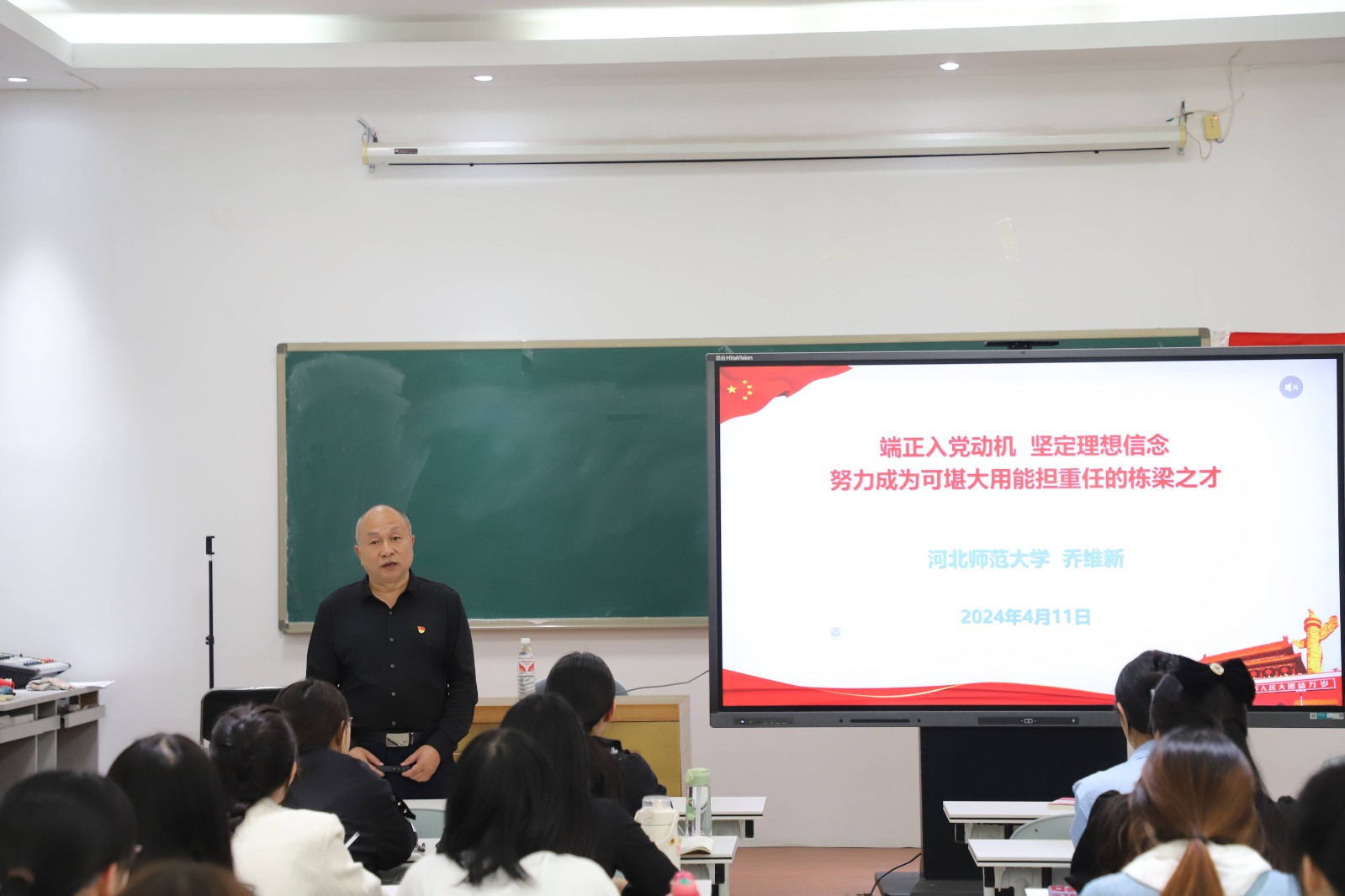 乔维新以《端正入党动机,坚定理想信念,努力成为可堪大用、能担重任的栋梁之才》为题,向同学们强调要坚定理想信念,加强思想政治建设,解决好世界观、人生观、价值观这个“总开关”问题,做合格的入党积极分子,自觉把小我融入祖国的大我之中,融入推进中国式现代化的火热实践,在报效祖国、服务人民中书写青春华章。