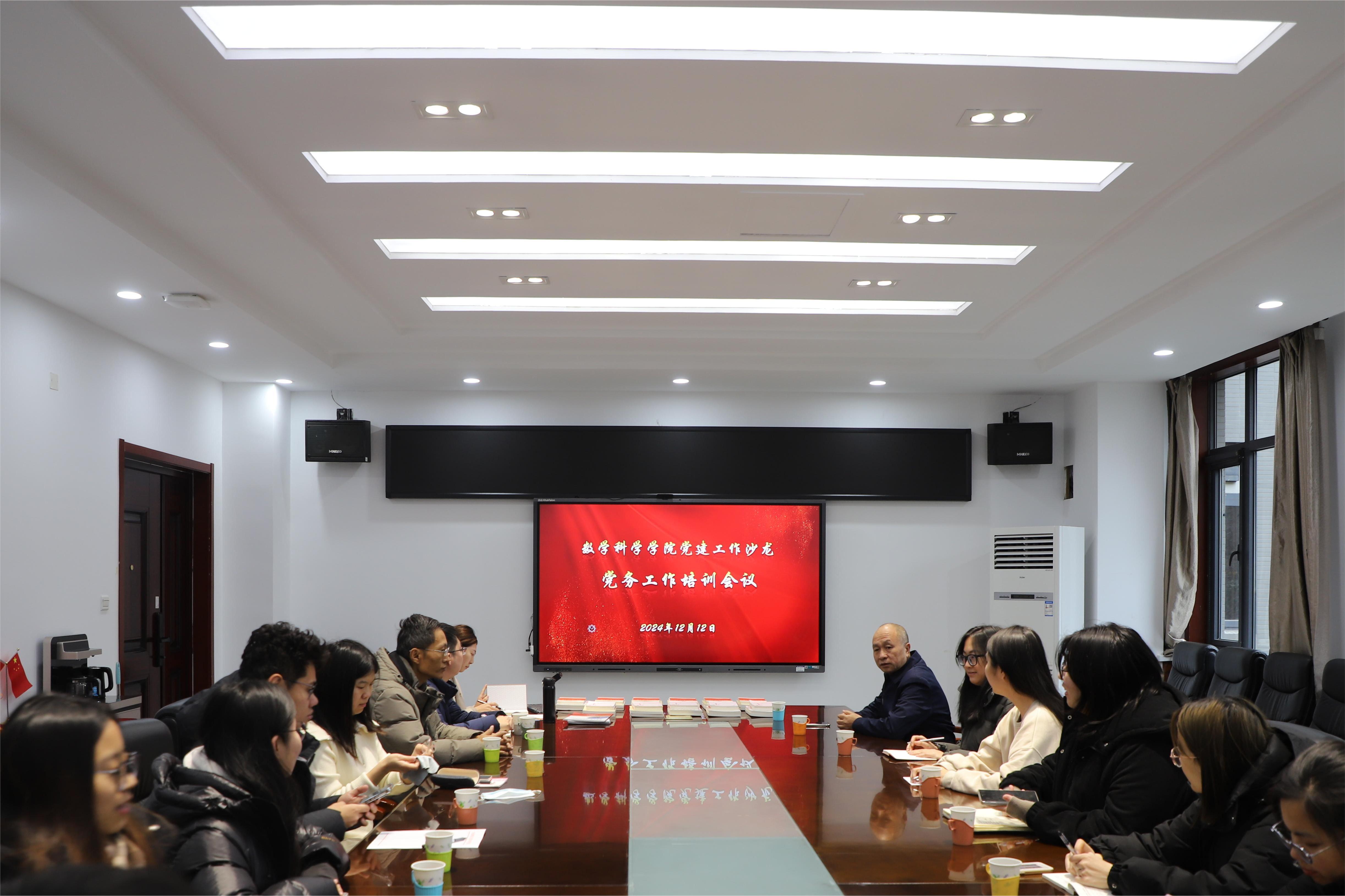 12月12日下午,数学科学学院在204会议室举办党支部书记工作沙龙暨党务工作培训会。本次培训以《中国共产党支部工作条例(试行)》及“三会一课”制度学习为重点,旨在强化党支部政治功能,提升党建平台维护水平。学院师生党支部书记、委员共17人参训。
